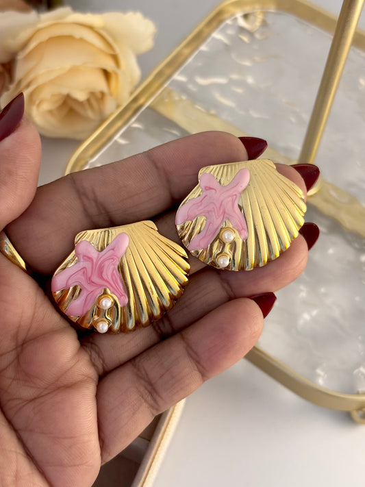 Ocean Shell Enamel Pearl Stud Earrings | Non-Tarnish Gold Plated