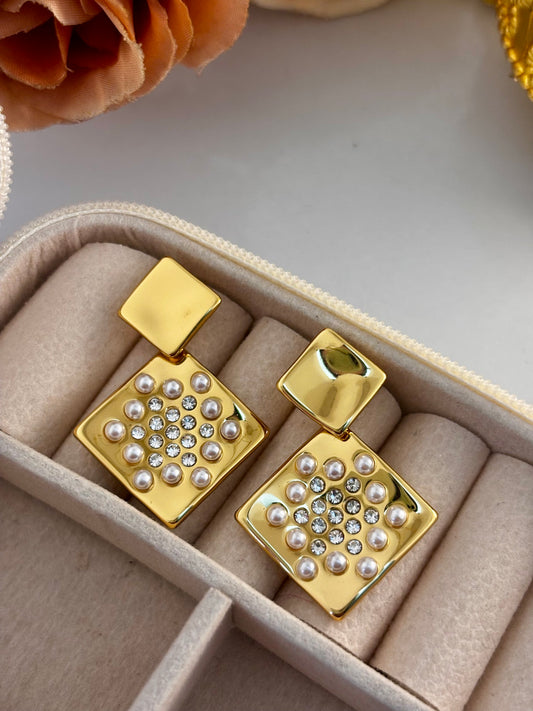 Gold Square Pearl Zircon Statement Earrings | Non Tarnish 18k Gold Plated
