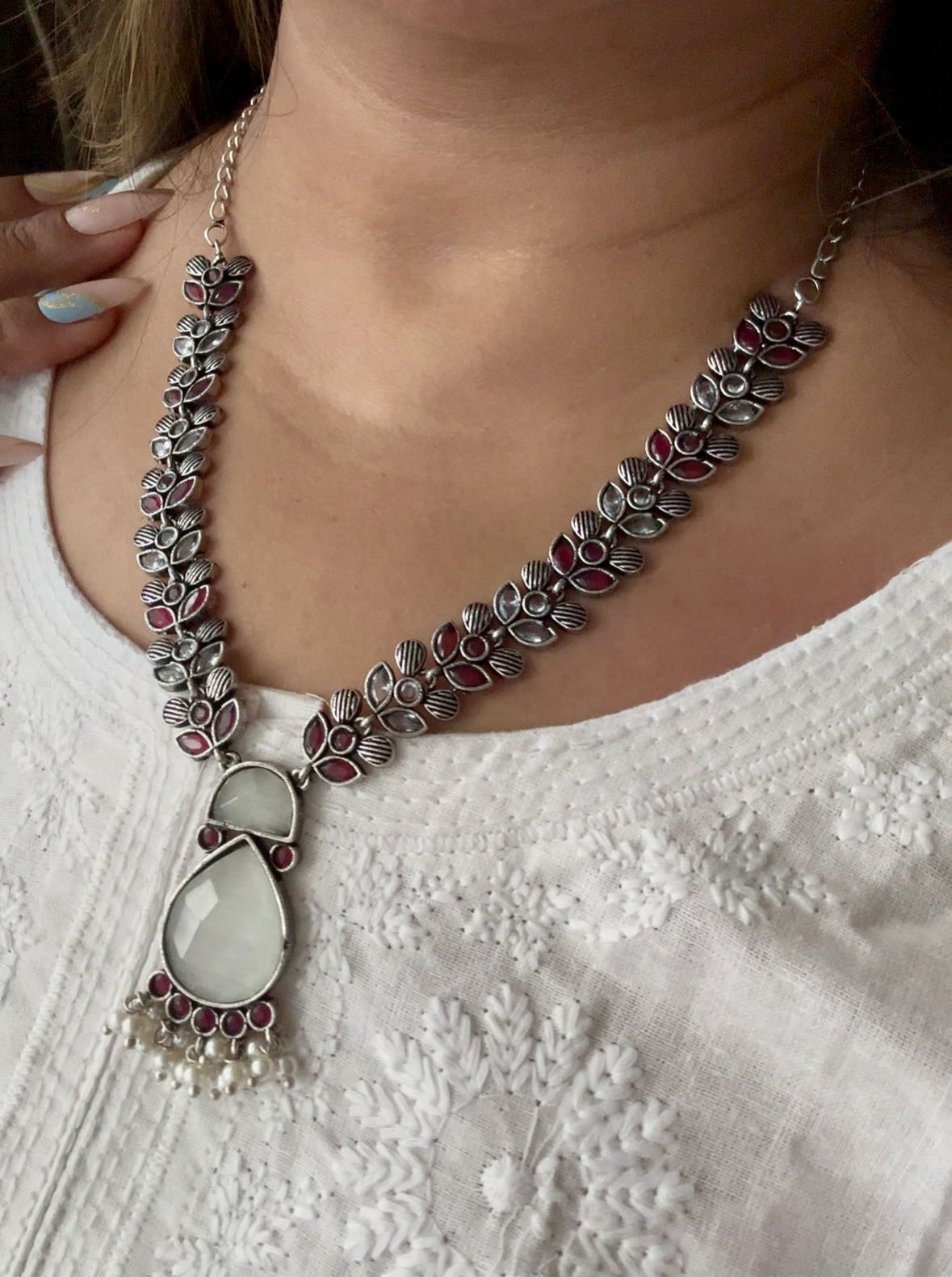 Handcrafted lightweight brass based silver replica jewellery set with vibrant multicolour stones and pearl accents. A unique, vintage- ethnic-style necklace and earrings perfect for festive and wedding wear.
