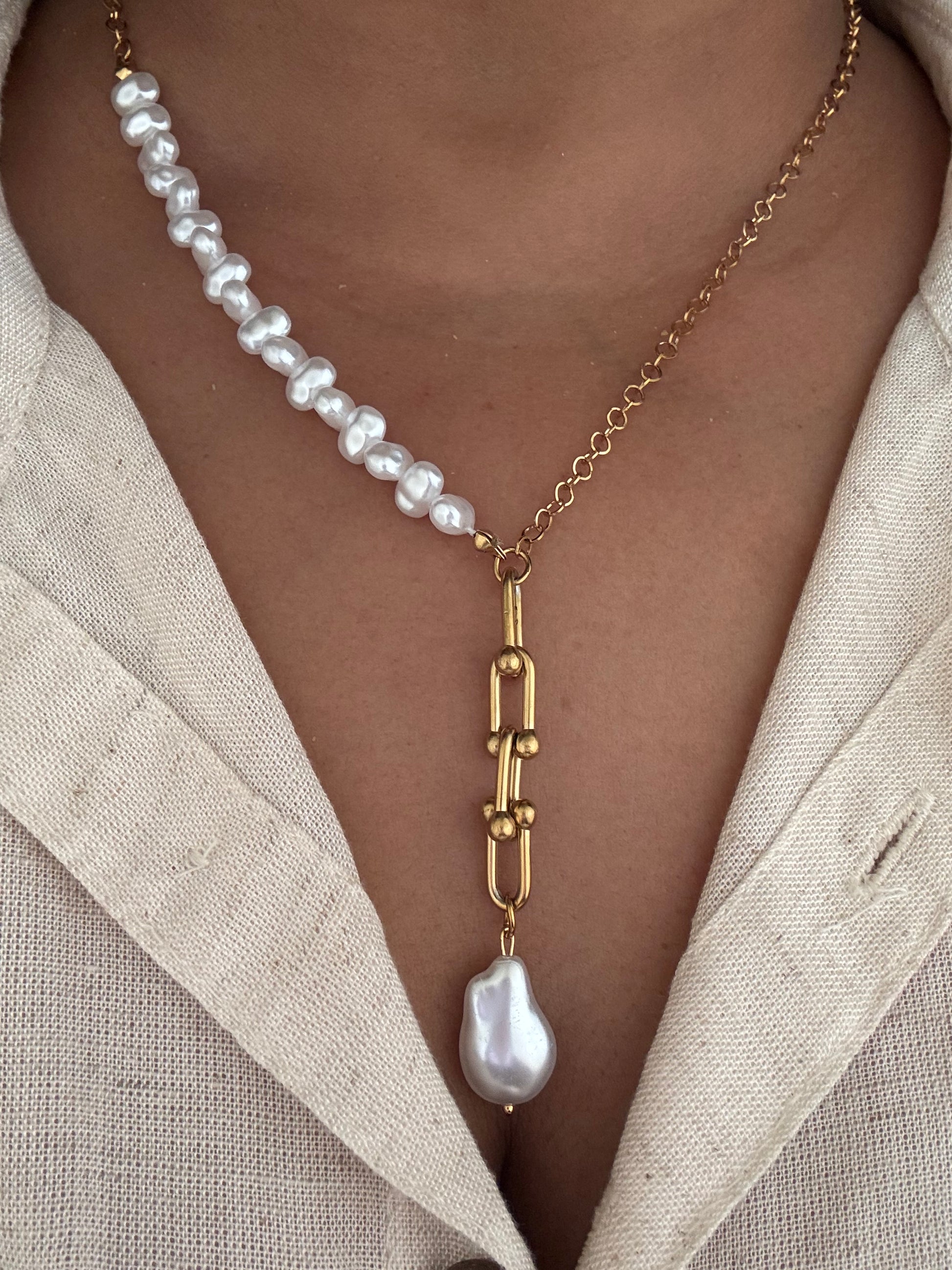 Make a statement with this lariat half pearls intertwined with bold stainless steel links, plated in 18K gold. Hypoallergenic and tarnish-resistant, this necklace is perfect for sensitive skin and everyday wear.