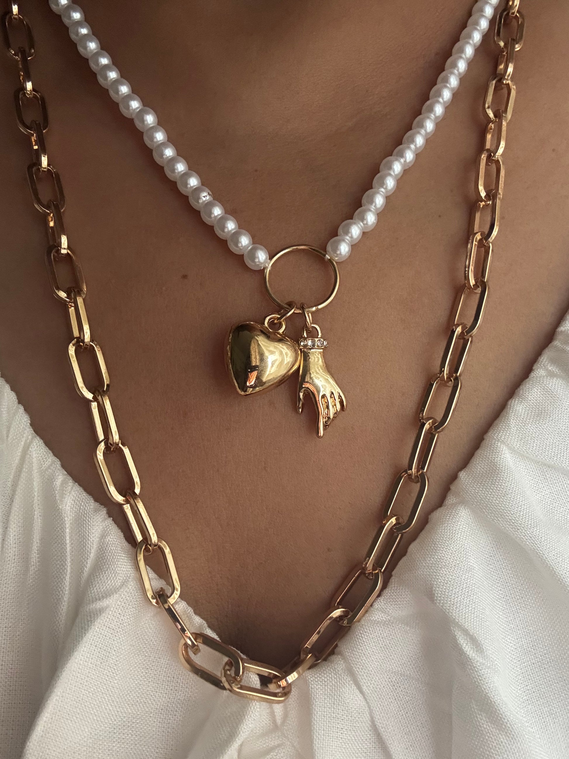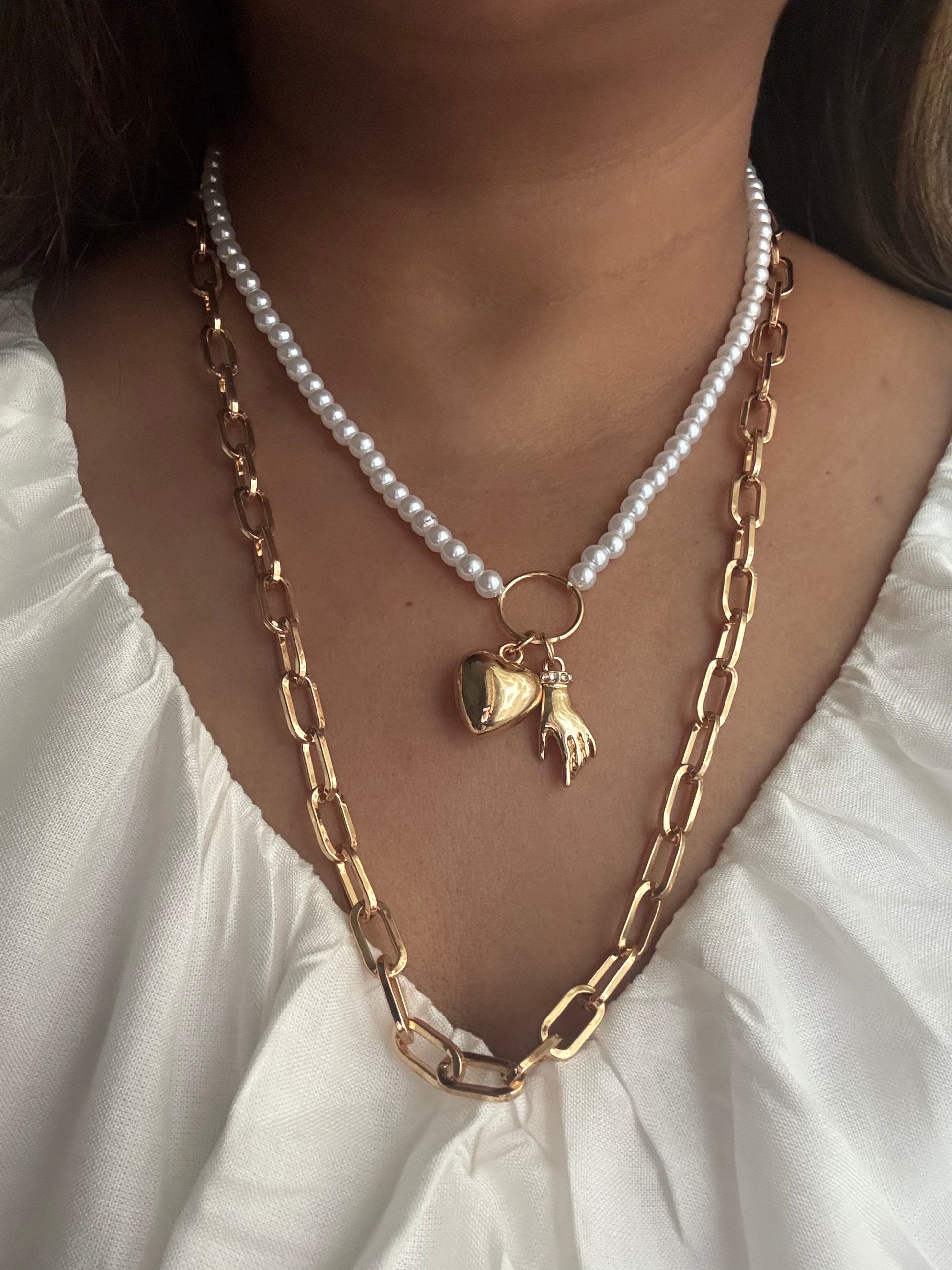 Named after Amora meaning love in Latin, this stunning 18K gold-plated piece features two contrasting layers - a classic pearl strand with a charm pendant and a bold gold chain.