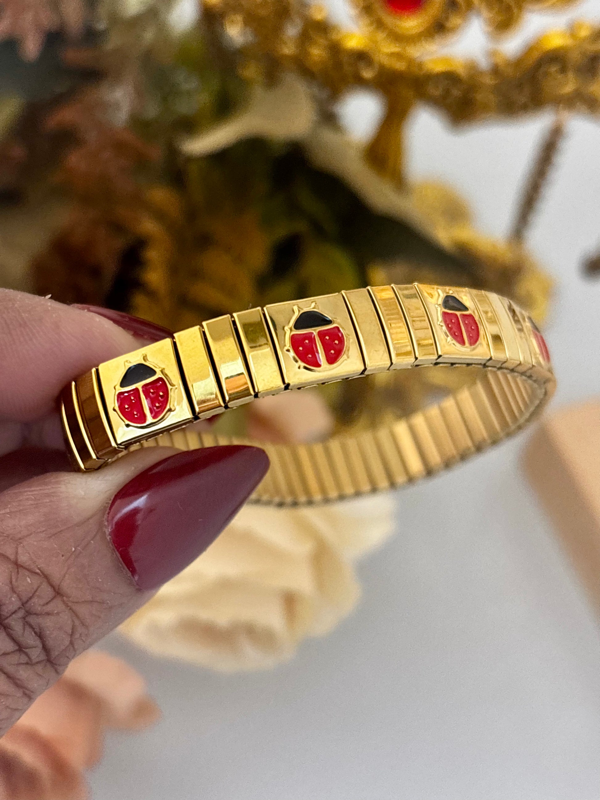 Gold plated ladybug Italian Charms bracelet crafted in stainless steel with enamel ladybug motifs.