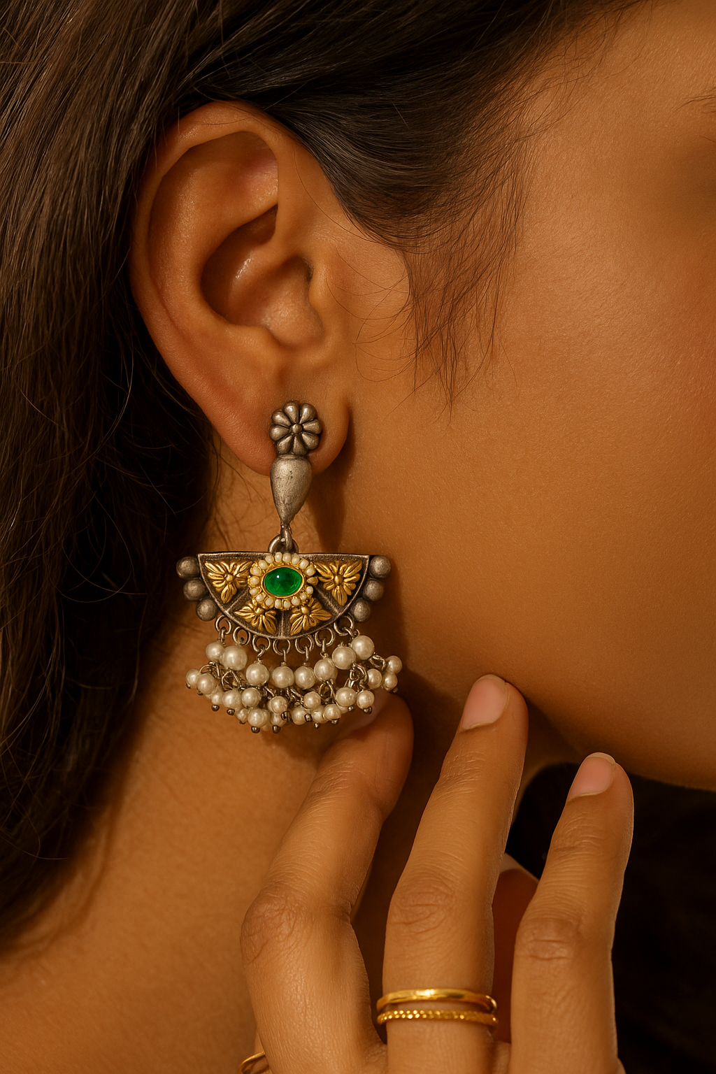 Intricately designed with oxidized silver, golden floral motifs, and delicate pearl clusters, Mehira captures the essence of vintage elegance.