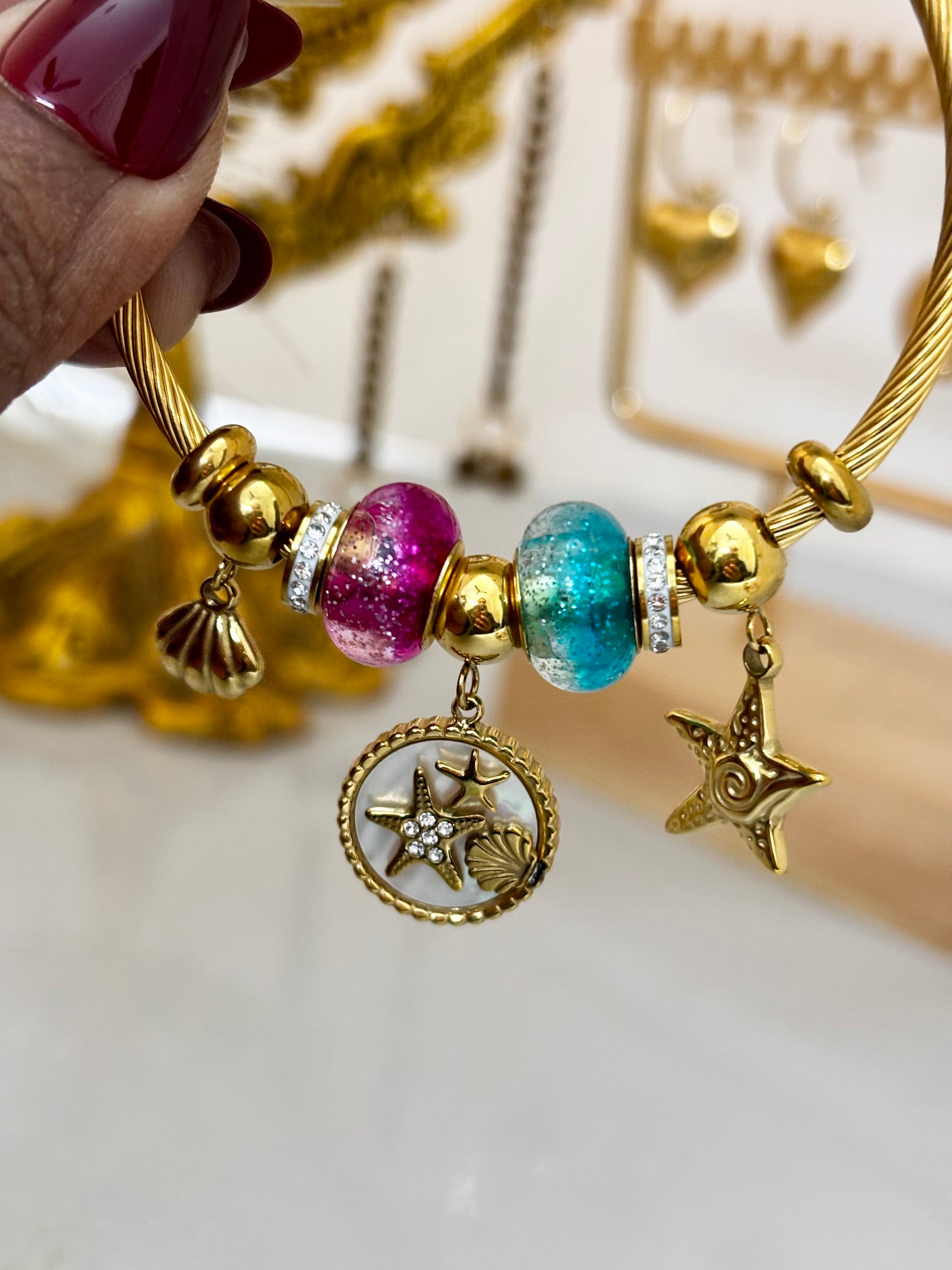 Pandora style starfish and shell charm bracelet crafted in gold plated stainless steel with colorful glass beads. Anti-tarnish, hypoallergenic and lightweight.